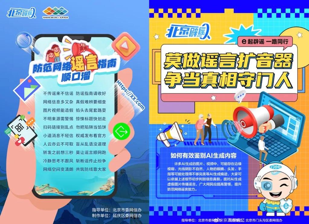 首都互联网协会发布《“e起辟谣 同心护网”倡议书》指导朝阳、门头沟、顺义、怀柔、延庆等区级网信部门创作主题宣传海报、推出防谣顺口溜、拍摄方言版辟谣短片,助力群众辨谣识谣。