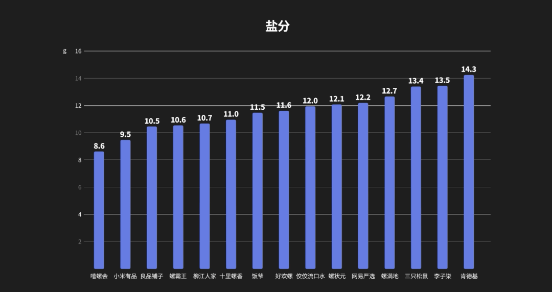 实测这些螺蛳粉的平均含盐量11g, 而我国居民膳食指南提倡每人每天食盐量6g,这样一来,一包螺蛳粉下肚,盐的摄入就超标快一倍了。