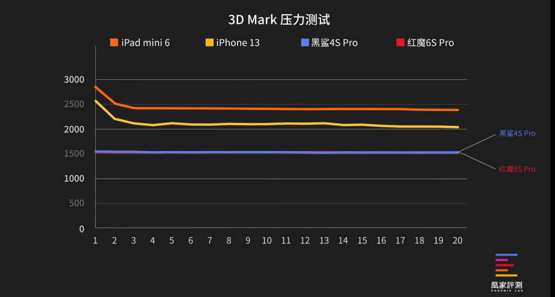 20轮测试下来,红魔和黑鲨的测试结果十分平稳,iPhone跟iPad mini则是在经过前两轮分数大幅下降后开始稳定。iPad mini分数要比iPhone高出一截,iPhone则比黑鲨、红魔高出一截。