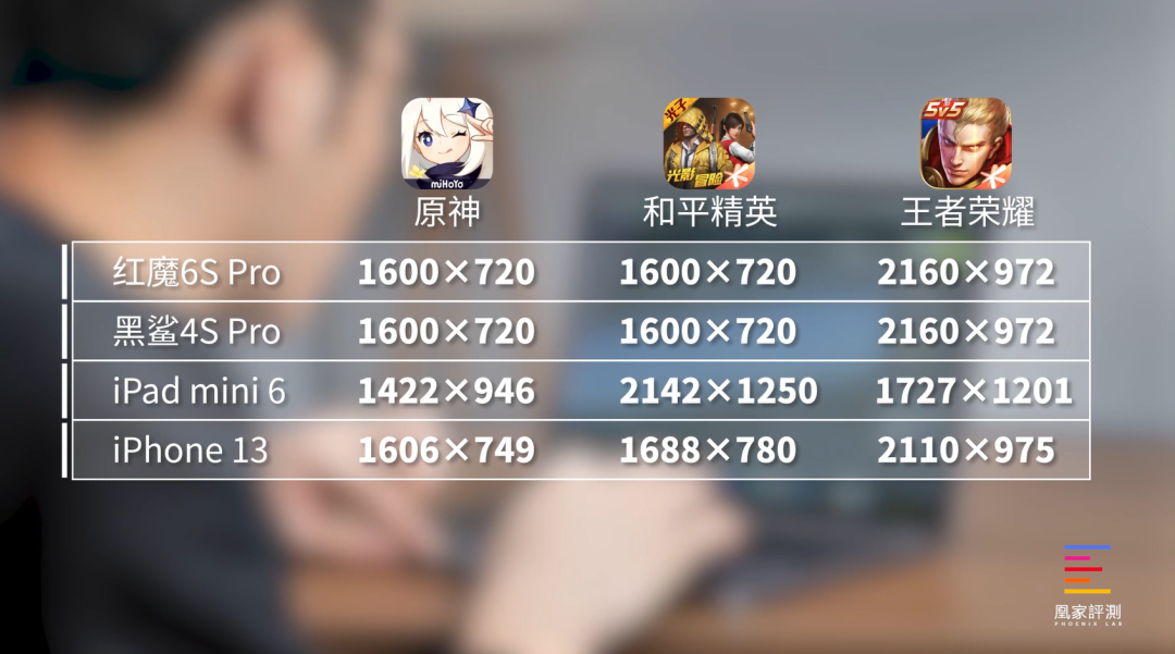 iPad mini和平精英跟原神的实际分辨率最高,但王者荣耀不如红魔黑鲨。iPhone 13的情况跟iPad mini相同,但分辨率都要低于iPad mini。
