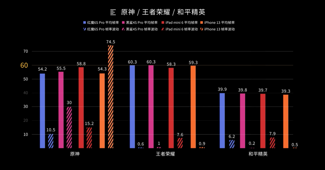iPad mini在原神中最有优势,红魔跟黑鲨表现也不差,但iPhone帧率波动方差达到了74.5。在王者荣耀跟和平精英上,黑鲨的表现最稳,iPhone 13次之,红魔在和平精英中出现了明显波动,iPad在这两个游戏表现都不如其他三款。