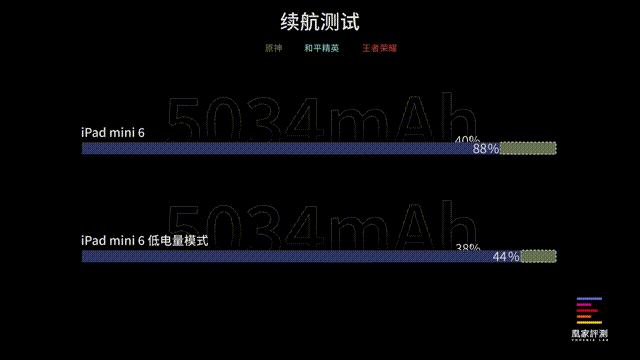 iPad mini这边,除了可以设置开始游戏后自动打开勿扰模式防止干扰,我们也测试了一直被大家戏称为游戏模式的低电量模式。从结果来看,低电量模式对iPad mini的帧率表现帮助不大,但同样的续航测试后,iPad mini只消耗了56%的电量,续航进步巨大。