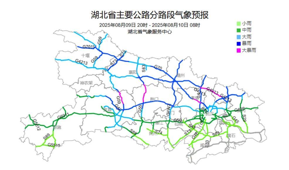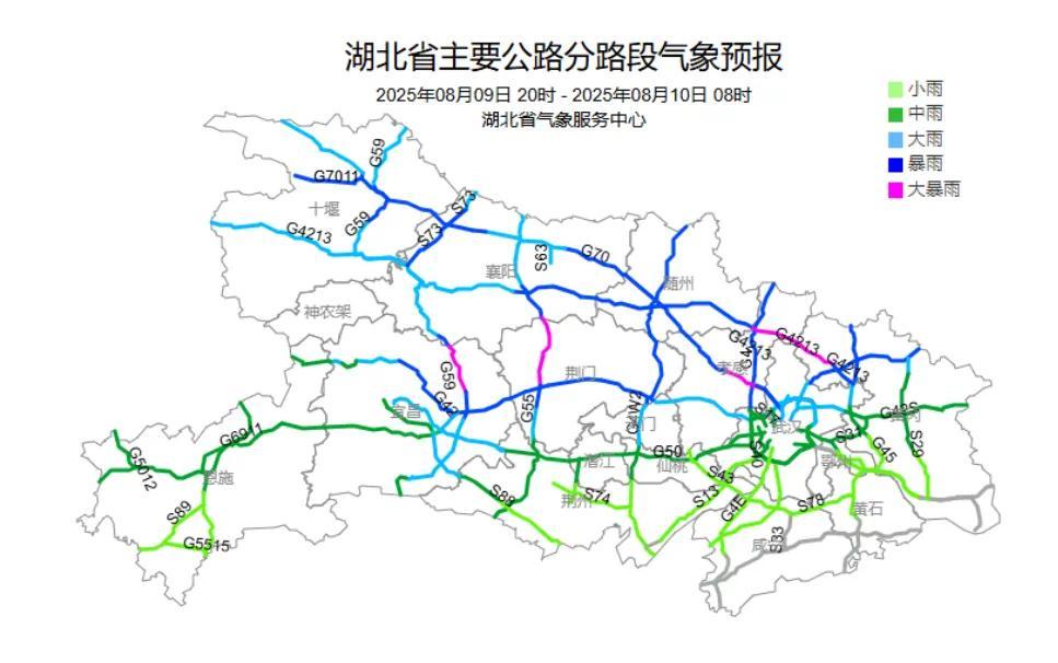 8月9日20时--8月10日8时:十堰、襄阳、随州、孝感、宜昌、荆门北部、武汉北部、黄冈北部等地有大雨到暴雨,局地大暴雨;其他地区多云有阵雨或雷阵雨。湖北省内部分地区伴有短时强降水、雷暴大风等强对流天气。