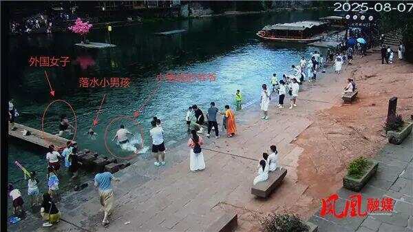 8月7日中午,在凤凰古城景区北门码头附近,一名小男孩在沱江岸边玩水时,突然落水被水冲走。在千钧一发之际,一位外国女游客毫不犹豫地跳入水中,成功将小男孩救上岸。