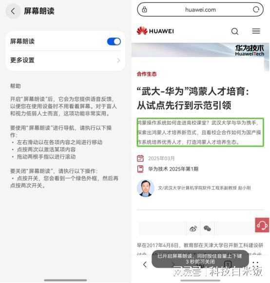 对于视障、视弱群体来说,操作智能手机会面临一些挑战。而HarmonyOS 5的屏幕朗读功能让他们能“听”到屏幕上的内容。点击屏幕任何位置,系统会立即朗读该区域内容,让他们能独立使用手机浏览新闻和阅读电子书。只需唤醒小艺说“打开屏幕朗读”就可以使用了。