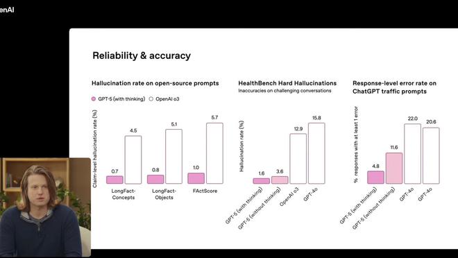 发布会现场,OpenAI团队详细介绍了GPT-5的各项能力。他们指出,GPT-5在多个基准测试中刷新了记录,尤其是在提高输出内容的可靠性和事实准确性方面取得了显著进展。团队还展示了一系列跑分数据,证实了GPT-5的强大性能。