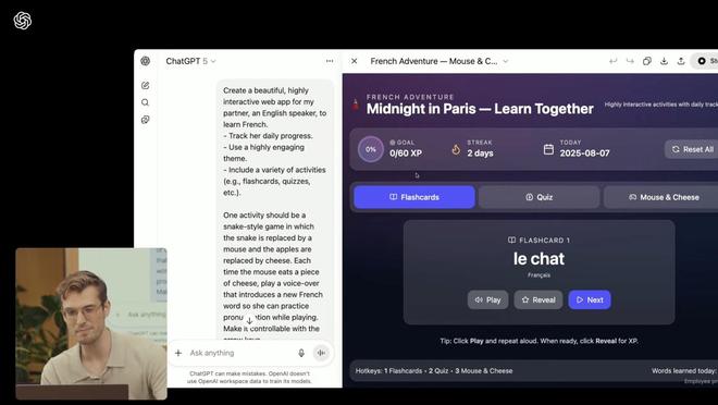 编程领域是GPT-5大放异彩的舞台。在演示中,GPT-5在几分钟内就生成了超过200行代码,创建了一个包含视觉和音频元素的网站,旨在帮助用户学习法语。这一表现再次证明了GPT-5在跨领域应用中的巨大潜力。