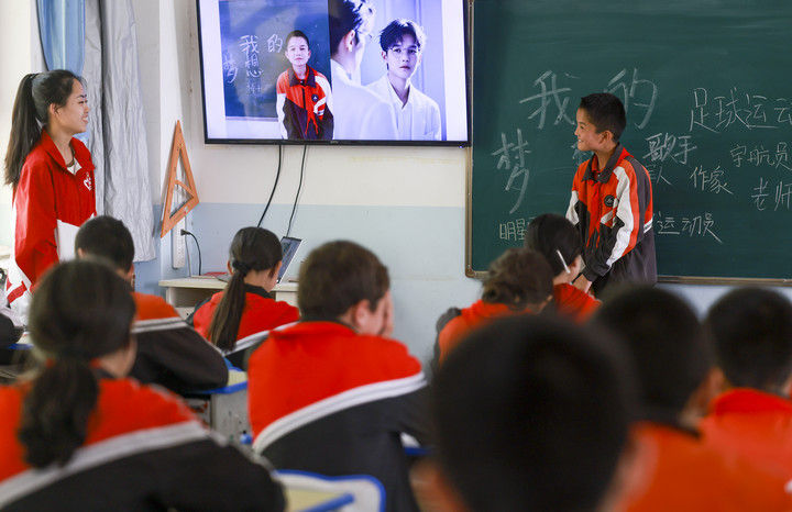 ▲新疆克孜勒苏柯尔克孜自治州阿图什市哈拉峻乡谢依特小学,是一所主要面向柯尔克孜族学生的村级小学,2022年8月成为该州首个西部计划志愿者包校支教的试点学校。23名戍边支教西部计划志愿者服务队的志愿者,在这所小学承担着教书育人的工作。经过近三年的支教服务,学生的学习成绩显著提高,得到当地广泛认可。这是2025年4月23日,支教教师高淑贤(左一)在班级里展示她为学生们制作的“AI梦想职业照”。