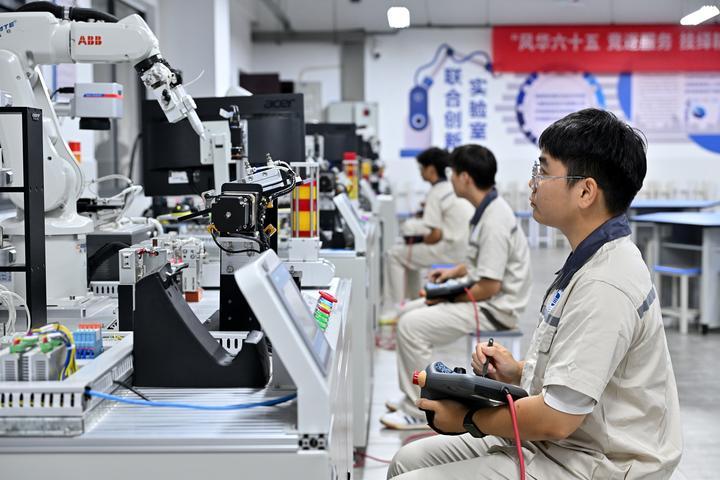 ▲2024年7月26日,湖南铁道职业技术学院的学生在工业机器人基础应用实训室接受工业机器人操控技能训练。教育部发布的数据显示,近年来,现代制造业、战略性新兴产业和现代服务业70%以上的新增一线从业人员来自职业院校。职业院校已经成为培养大国工匠、能工巧匠、高技能人才的主阵地。