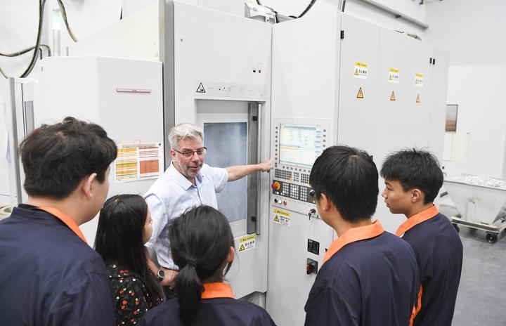 ▲2024年4月16日,在位于重庆市永川区中德产业园的埃斯维(重庆)机床有限公司,公司技术总监向重庆城市职业学院中德产业学院学生介绍设备操作规范。近年来,重庆城市职业学院联合德国教育力量共建产业学院,引入职业教育先进经验,着力培养适合制造型企业需求的高素质技能技术人才。