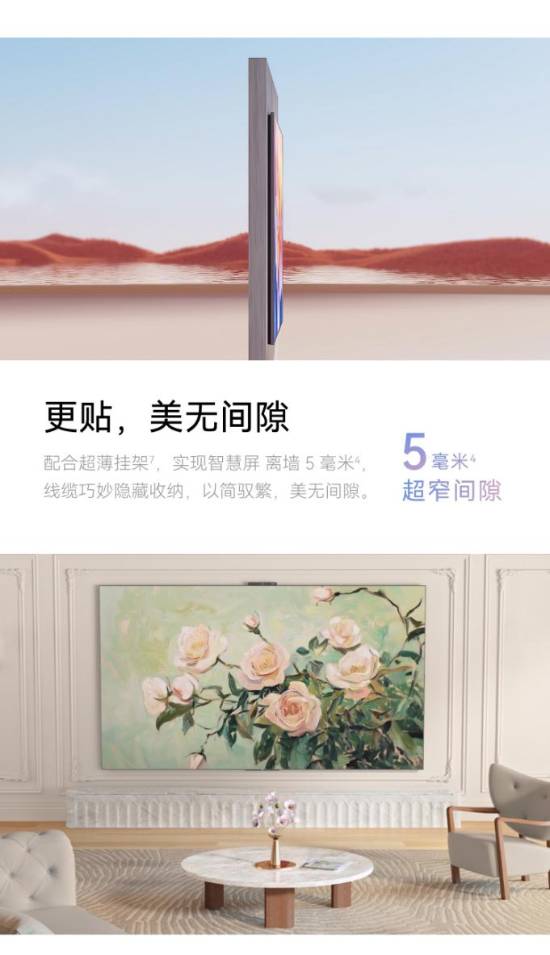 华为Vision智慧屏5全尺寸机型整机厚度低于49mm,背板离墙仅5mm,彻底告别传统电视的“小书包”烦恼。在屏幕设计上,华为Vision智慧屏5屏占比高达99%,采用纯黑超窄边框,呈现出四面等宽屏效果,从正面望去,几乎不见边框。