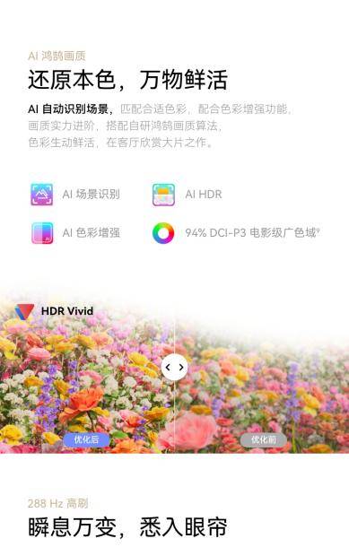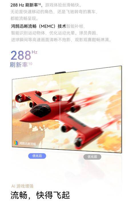 此外,鸿蒙AI借助场景预加载技术,使应用启动速度加快40%。配合288Hz倍频技术与MEMC插帧技术,观看高速运动画面时实现零拖影。
