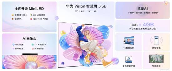 值得一提的是,华为Vision智慧屏5之外,同期推出的华为Vision 智慧屏5 SE,售价2799元起,具备4K超级投屏、240Hz Mini LED超清护眼、鸿蒙AI及AI摄像头。