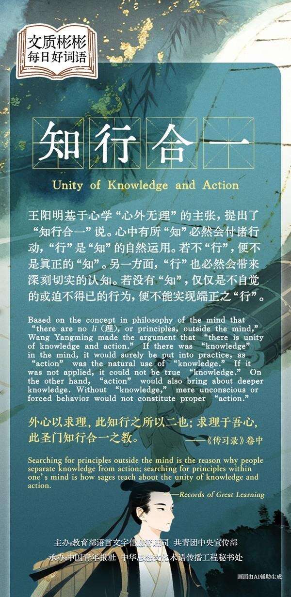 对“知”“行”关系的一种认识。王阳明基于心学“心外无理”的主张,提出了“知行合一”说。他认为,对人伦日用之道的体认与践行不能割裂,二者是一体的两面。心中有所“知”必然会付诸行动,“行”是“知”的自然运用。若不“行”,便不是真正的“知”。另一方面,“行”也必然会带来深刻切实的认知。若没有“知”,仅仅是不自觉的或迫不得已的行为,便不能实现端正之“行”。