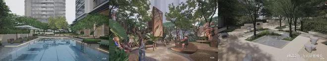 【元气营地运动场】约500㎡轻运动中心,与1栋架空层联动,设置不同功能运动器械以热身-力量-球类区循环,遵循健身规律设置,享家门口的自然运动中心。【自然水岸游泳池】约400㎡无界亲子多元互动型泳池,与7栋架空层联动,在架空层内布置淋浴更衣、消毒池等功能,与周边绿化融合,无硬边界,绿植做隔断,旁边设置跌水景观。【达尔文营地游乐场】约1500㎡规模,营地以大叶王国为主题,将生态教育、艺术文化结合成为自然探索乐园、游乐场为一体的多元活动场景。同时于6栋架空层相连,配置儿童自由玩耍的空间。【庭院花园】每户楼栋单元门前定制入户庭院,给予业主学习、办公、会客、休闲等交流空间。