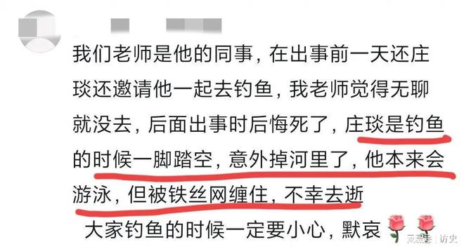 庄琰是因为钓鱼的时候一脚踏空,意外掉进河里了。原本他是会游泳的,奈何落水之后被铁丝网缠住了,才会不幸去世。