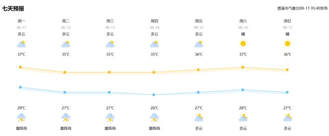 据市气象台预报,今天多云午后局部雷阵雨,明天多云有时有阵雨或雷雨,西南风3级,杭州湾水面西南风5~6级。今天最高气温37℃,明天最低气温27℃。昨日气温实况:最高37.8℃,最低30.0℃。今天的相对湿度40~75%,蒸发量5毫米。
