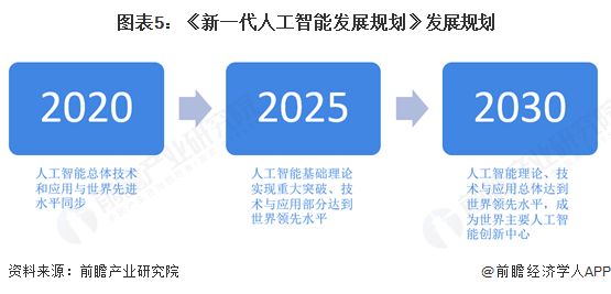 《新一代人工智能发展规划》是我国在人工智能领域进行的第一个系统部署的文件,也是面向未来打造我国先发优势的一个指导性文件,重点对2030年我国新人工智能发展的总体思路、战略目标和主要任务、保障措施进行系统的规划和部署。《规划》确立了“三步走”目标:到2020年人工智能总体技术和应用与世界先进水平同步;到2025年人工智能基础理论实现重大突破、技术与应用部分达到世界领先水平;到2030年人工智能理论、技术与应用总体达到世界领先水平,成为世界主要人工智能创新中心。