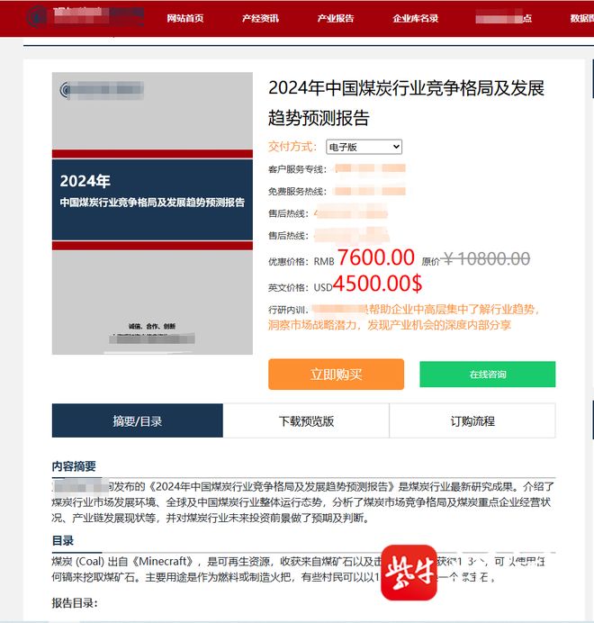 5月14日,某网站发布的一份标题为《2024年中国煤炭行业竞争格局及发展趋势预测报告》的内容引发网友热议,该报告售价为7600元人民币,网页预览的目录中写道:“煤炭(coal)出自《Minecraft》,是可再生资源,收获来自煤矿石及击杀凋零骷髅获得1-3个,可以使用任何镐来挖取煤矿石。主要用途是作为燃料或制造火把,有些村民可以以15个煤炭交换一个绿宝石。”