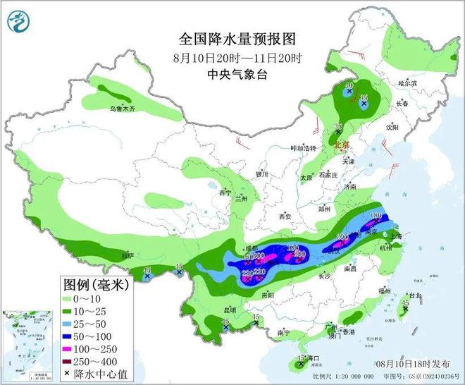 10日20时至11日20时,四川中南部、重庆、云南东北部、贵州北部、湖北中南部和东部、湖南北部、河南东南部、安徽中北部、江苏中南部以及内蒙古中部、河北北部等地部分地区有大到暴雨。温馨提示:未来三天,部分地区累计雨量大并伴有短时强降水,公众需警惕持续降雨或局地强降雨可能引发的山洪、泥石流等次生灾害,避免前往山区、河谷等地质灾害隐患点。