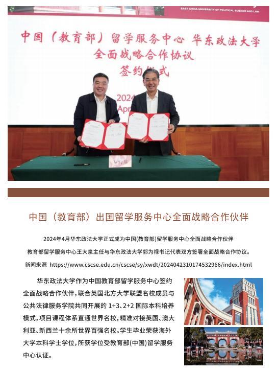 2024年,我国“五院四系”核心名校华东政法大学与中国(教育部)留学服务中心签订战略合作协议,成为中留服官方合作伙伴。华政与英国北方大学名校联盟共同创办对接英新澳十余所QS百强名校国际本科项目!