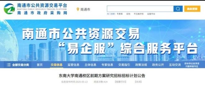 5月13日,南通市公共资源交易平台发布了《东南大学南通校区前期方案研究招标招标计划公告》。根据公告,东南大学南通校区项目计容面积约43万平方米,中标人须完成东南大学南通校区前期方案研究,合同估算价为1800万元。