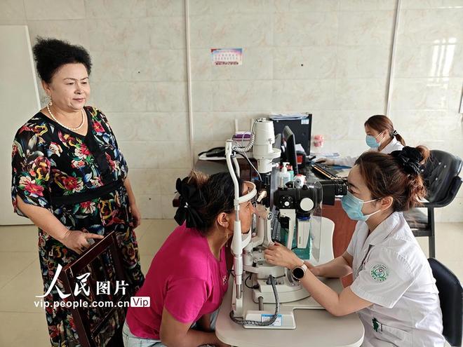 2025年6月4日,新疆阿克苏地区阿瓦提县阿瓦提镇花园社区活动室内,眼科医护人员为村民开展免费眼部健康筛查活动。包良廷摄(人民图片网)