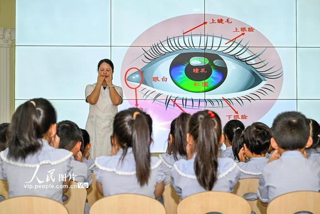 2025年6月5日,江西省抚州市南丰县登高小学,医生在向学生讲解眼睛的构造。谢东摄(人民图片网)