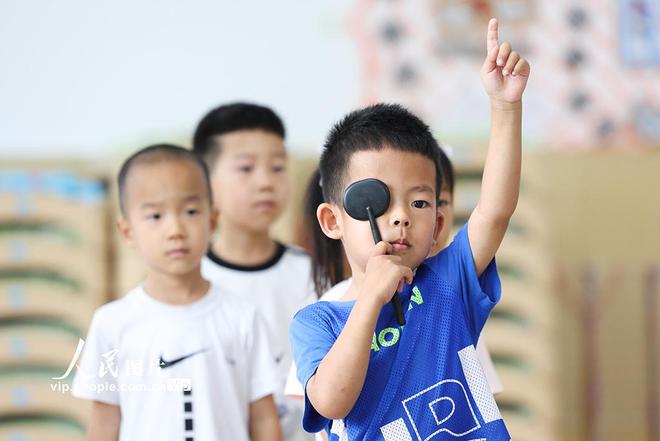 2025年6月5日,河北省石家庄市华北幼儿园的小朋友在老师组织下,有序接受视力筛查。梁子栋摄(人民图片网)