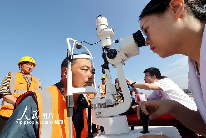 2025年6月5日,在浙江省湖州市德清县杭德市域铁路项目工地,德清县中医院医务人员为中铁十一局铁路工人进行眼病筛查。谢尚国摄(人民图片网)