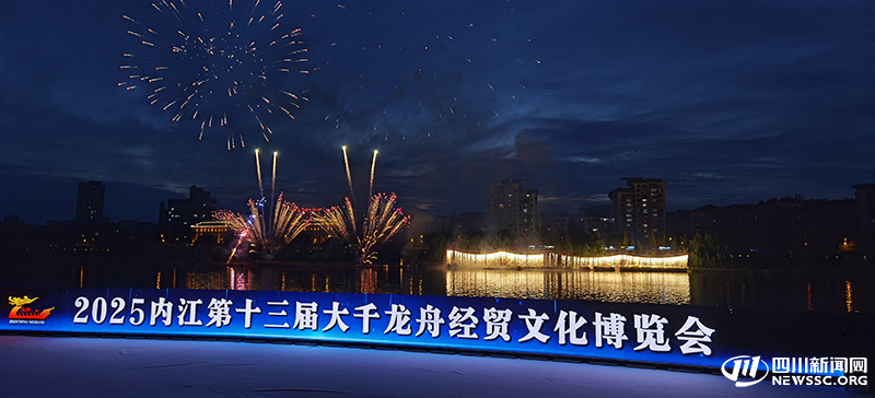 5月29日晚,2025内江第十三届大千龙舟经贸文化博览会开幕,一场融合文艺、科技与文化魅力的水陆空视觉盛宴在内江甜城湖畔震撼上演。