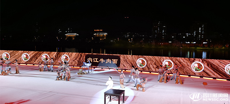 除视觉盛宴外,文艺演出也亮点纷呈。两个多小时的文艺表演中,内江原创歌舞《张大千-仕女图》《内江牛肉面》、新创杂技节目《哪吒闹海》、资中木偶戏等内江特色非遗展示节目轮番上演,为观众献上了一场文化“大餐”。