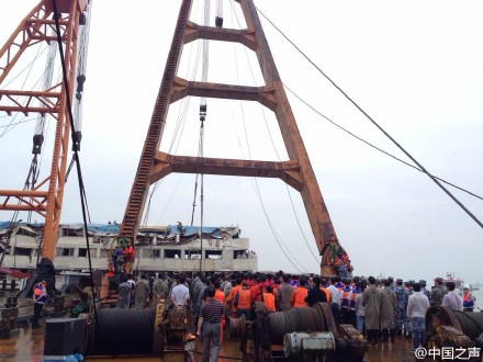 随后,18时20分左右开始,3艘起吊船同时作业,船体抬升速度明显加快。半小时后,“东方之星”基本全部出水,救援人员已进入舱内。