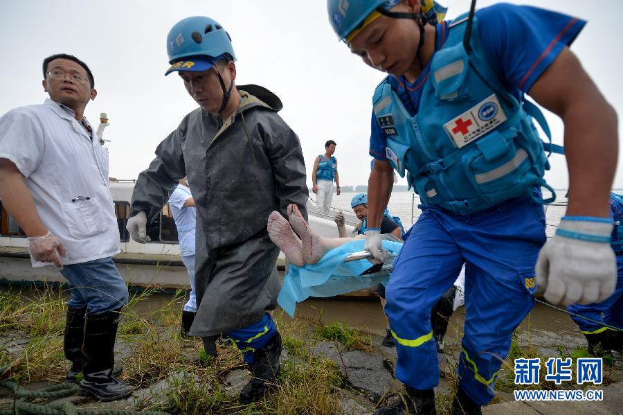当日下午2时左右,红十字蓝天救援队将打捞到的3具遇难者遗体运送至岳阳市华容县新江渡口,据参与搜救的红十字蓝天救援队负责人徐湘平介绍,3具遇难者遗体都是当日上午9时至11时在距离湖北监利水域沉船地点五十公里左右的湖南岳阳市君山区境内发现的。新华社记者白禹摄