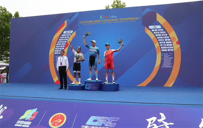 5月18日下午,在一片欢呼声和加油声中,2025中国公路自行车职业联赛(团泊健康城站)的第一名冲线选手越过终点。