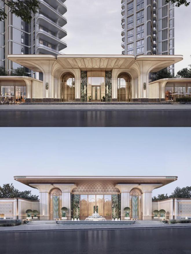 焕新升级的建筑立面,巧妙融合传统与现代艺术,顶部匠心独运,选用古典宝相花纹装饰,宝相花纹寓意吉祥如意与财富丰盈,搭配半隐框系统门窗与精致铝板金属线条,尽显现代风格与古典美的和谐交融。顶部造型亦如绽放的牡丹,又如绽放的莲花,兼具牡丹的富贵荣华和莲花的纯洁与高雅。外立面设计简约而不失经典,时尚中透露着深厚的文化底蕴。南立面窗间墙采用玻璃封闭,营造出类似公建的幕墙风格,彰显现代建筑风貌。层间与竖向线条均由铝板精心打造,线条流畅且挺拔,历久弥新,为整体建筑注入无限魅力,展现出独特的美学价值。