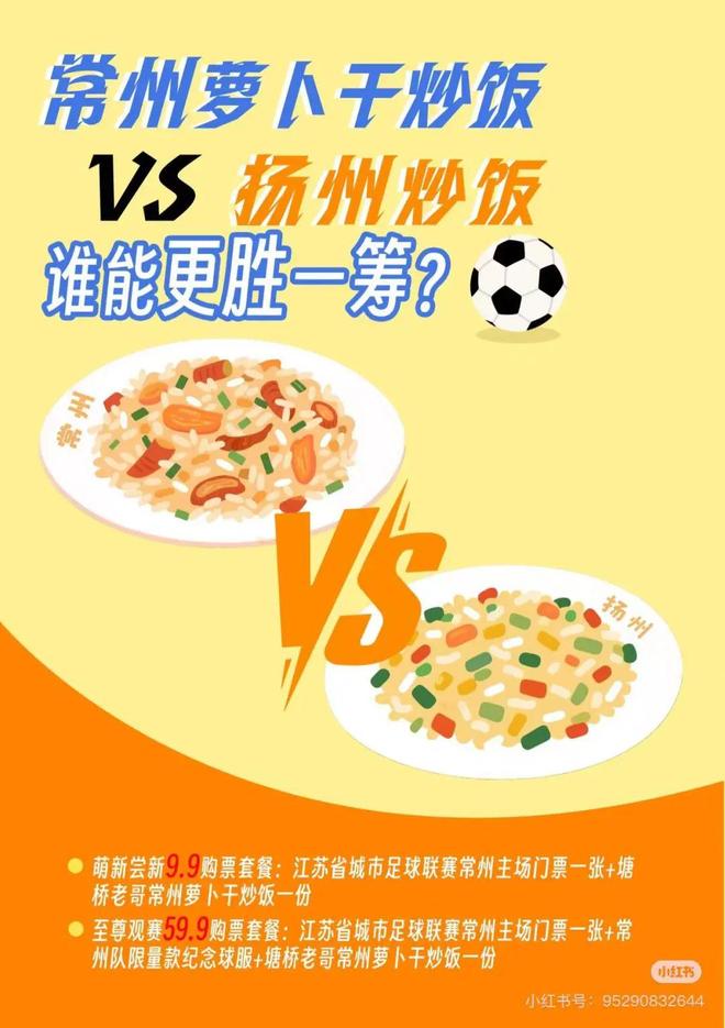 市级单位把江苏城市足球联赛当作文体领域的头等大事,而下面的市足球协会为了拉更多人进场,也使出了浑身解数。比如常州市足协就推出了“买门票送炒饭”的福利套餐,花9.9元可以获得一张门票和一份萝卜干炒饭,花59.9元的线元套餐的基础上再获得一件常州队限量款纪念球服。有意思的是,常州队推出这一政策的那场比赛,对手刚好是以炒饭著称的扬州,这属实是在挑衅扬州人了。