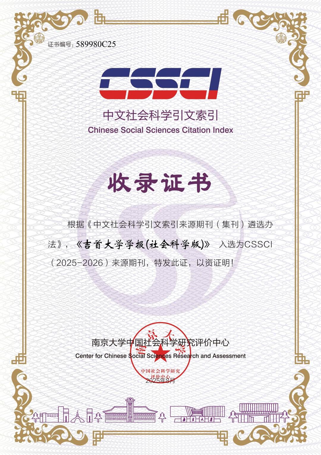近日,南京大学中国社会科学研究评价中心新一轮来源期刊(集刊)遴选结束,《吉首大学学报(社会科学版)》入选CSSCI(2025-2026)来源期刊。截至本轮遴选,《吉首大学学报(社会科学版)》已连续5轮次入选CSSCI来源期刊目录。