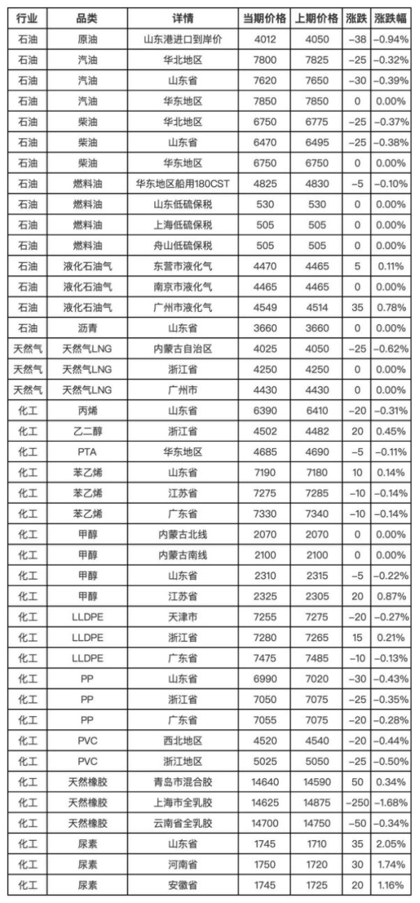 今日石油、天然气行业下跌为主。需求支撑有限,供应相对充足,生产商为求出货压低报价叠加国际原油收盘下跌的消息面利空因素,整体市场报价小幅下滑,买家按需入市,市场底部支撑不足,价格下行压力增加。化工行业小幅波动调整,各产品涨跌互现,总指数微涨。