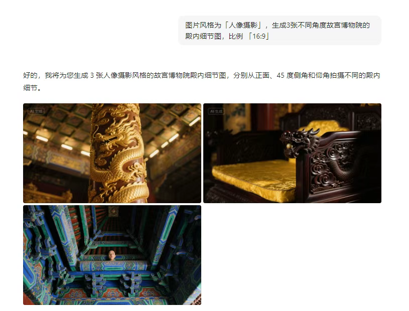 豆包功能应用:教师借助豆包的 “生图 + 生视频” 功能,针对语文《故宫博物院》一课,输入指令 “生成3张不同角度故宫博物院的殿内细节图”,并根据图片生成相应的动态视频,将生成的内容嵌入课件用于课堂导入。