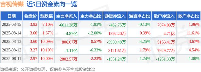 证券之星消息,截至2025年8月15日收盘,吉视传媒(601929)报收于3.92元,上涨7.1%,换手率27.72%,成交量967.25万手,成交额36.08亿元。