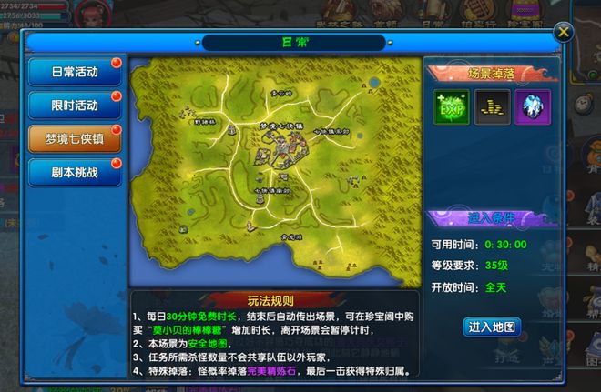 在游戏内,玩家需达到35级方可开启梦境七侠镇玩法, 全天开放,限时30分钟,离开场景时间会暂停