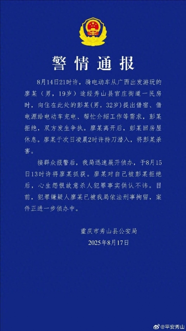 2025年8月15日,重庆秀山县一名32岁的门窗工人彭某,在宿舍内被19岁的廖某持刀杀害。而悲剧的起因,仅仅是彭某拒绝了廖某借宿、充电、介绍工作的请求。更令人发指的是,廖某杀人后竟淡定地用被害人的锅煮面吃,然后在二楼酣睡直至被捕。