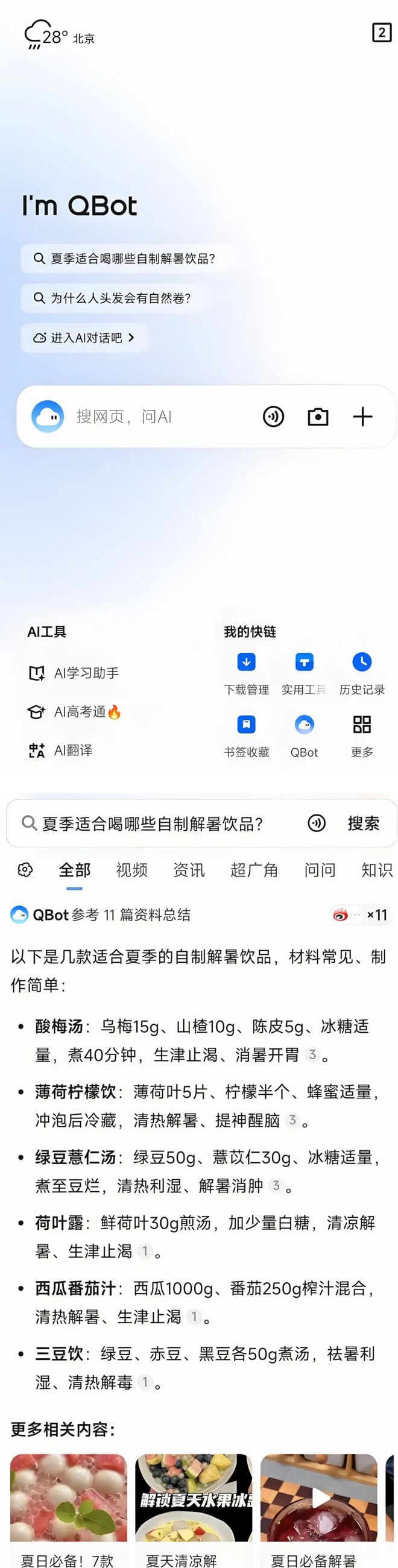 以QQ浏览器为例,今年5月,QQ浏览器宣布升级为AI浏览器,并用AI搜索取代原首页内容。从实际体验看,其Qbot AI侧重生活百科类对话解答,其首页内容即引导用户向AI提问百科类问题,如“夏季自制解暑饮品”等。