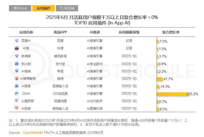 而在本轮移动互联网AI插件的爆发中,市场的主要增长来自搜索产品。其中,QQ浏览器凭借产品整体转型势能,用AI搜索入口Qbot替换原搜索入口,复合增长率高达255.2%,微博推出的AI微博智搜则以41.7%的复合增长率位列次席;百度、抖音、夸克等资讯/社媒平台AI插件应用均有不同程度增长。