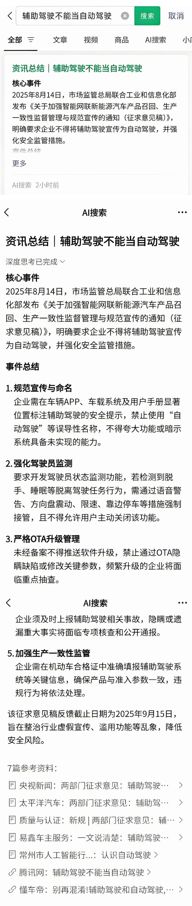 以微信AI搜索为例,在产品入口上,微信选择在用户检索热点事件、提出问题时优先展示AI搜索结果。如检索热点话题“辅助驾驶不能当自动驾驶”,微信AI搜索可生成事件详情、事件总结内容。