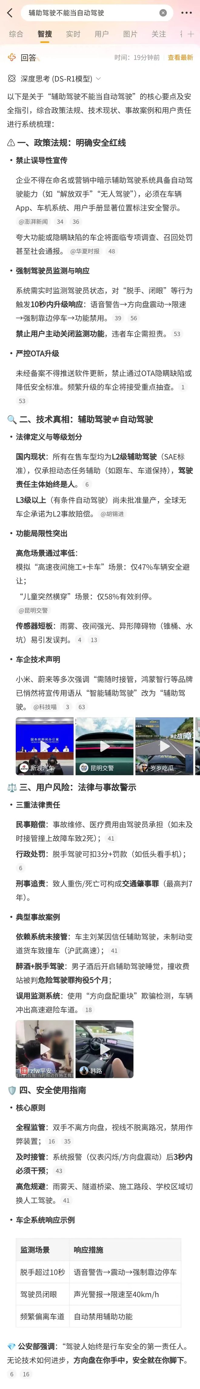 同样搜索“辅助驾驶不能当自动驾驶”话题,微博智搜提供了政策法规、技术现状、用户风险、安全使用指南内容,在介绍相关政策出台动作的同时,也将相关技术领域的大致现状向读者进行了梳理。