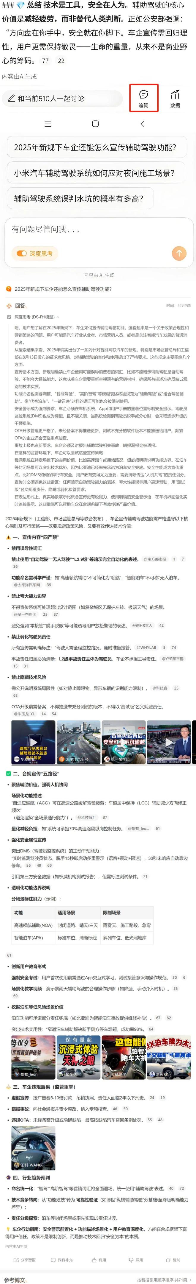 如在“辅助驾驶不能当自动驾驶”智搜结果下,选择“追问”可自动获取推荐检索问题,选取后可生成同样详尽的回答。