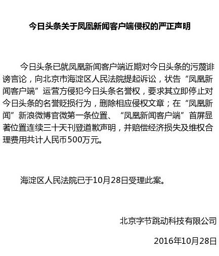 北京市海淀区人民法院已于凤凰新闻客户端提起诉讼当天受理此案。凤凰新闻客户端表示,保留就今日头条恶意不正当行为采取进一步法律手段的权利。