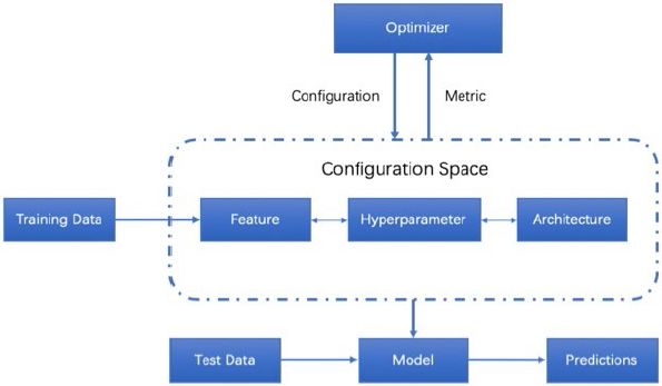 自动机器学习(AutoML)旨在通过让一些通用步骤(如数据预处理、模型选择和调整超参数)自动化,来简化机器学习中生成模型的过程。AutoML是指尽量不通过人来设定超参数,而是使用某种学习机制,来调节这些超参数。这些学习机制包括传统的贝叶斯优化,多臂(multi-armed bandit),进化算法,还有比较新的强化学习。自动机器学习不光包括大家熟知的算法选择,超参数优化,和神经网络架构搜索,还覆盖机器学习工作流的每一步。自动机器学习的用处就在于此,它帮助研究人员和从业者,自动构建机器学习管道,将多个步骤及其对应的多个选项集成为工作流,以期快速找到针对给定问题的高性能机器学习模型。AutoML的基本过程如下图所示:虚框是配置空间,包括特征、超参数和架构;左边训练数据进入,上面的优化器和它相连,定义的测度发现最佳配置,最后出来的是模型;测试数据在模型中运行,实现预测的目的。